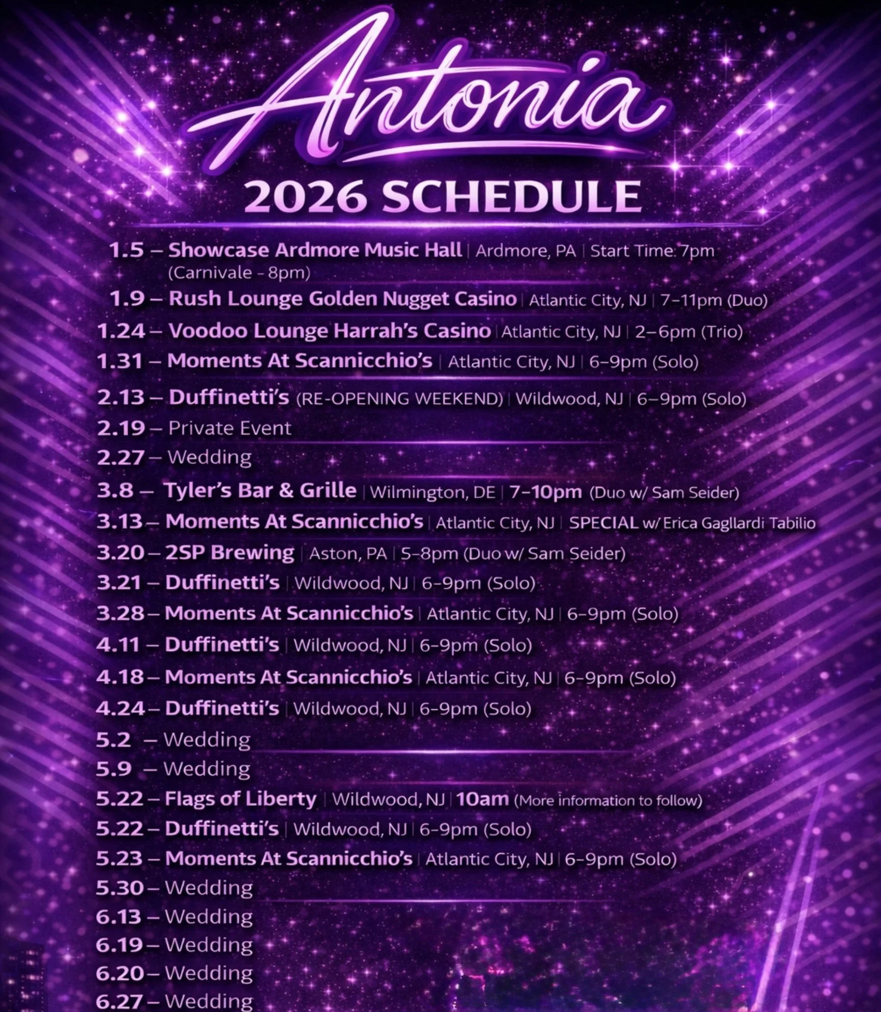 New Jersey native, Antonia, is a professional singer/songwriter. Antonia has worked with a plethora of professional wedding and party bands for over the past seven years. Antonia has played hundreds of gigs in New Jersey, Pennsylvania, New York, California, and more!